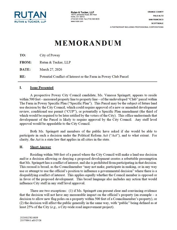 Potential Conflict of Interest re the Farm in Poway Club Parcel